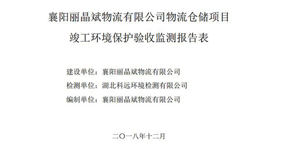 襄陽(yáng)麗晶斌物流有限公司 襄陽(yáng)麗晶斌物流有限公司物流倉(cāng)儲(chǔ)項(xiàng)目 竣工環(huán)境保護(hù)驗(yàn)收公示 根據(jù)《建設(shè)項(xiàng)目環(huán)境保護(hù)管理?xiàng)l例》(國(guó)務(wù)院令第682號(hào))和《建設(shè)項(xiàng)目竣工環(huán)境保護(hù)驗(yàn)收暫行辦法》的有關(guān)規(guī)...